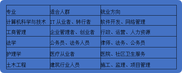 � 优势:学习时间灵活、不影响工作、学费较低、社会认可度高。