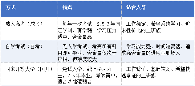 根据工作节奏与个人基础,上班族可选择以下三种国家承认的学历提升形式: