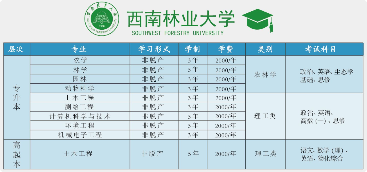 西南林业大学是国家卓越农林人才教育培养计划、国家“特色重点学科项目”高校。其继续教育学院主要面向在职从业人员,提供专升本层次的学历提升。