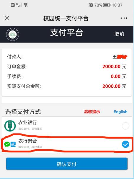 第七步:选择“农行聚合”打勾,然后点确认支付即可。里面包含微信和支付宝缴费方式,最好使用微信支付方式。
