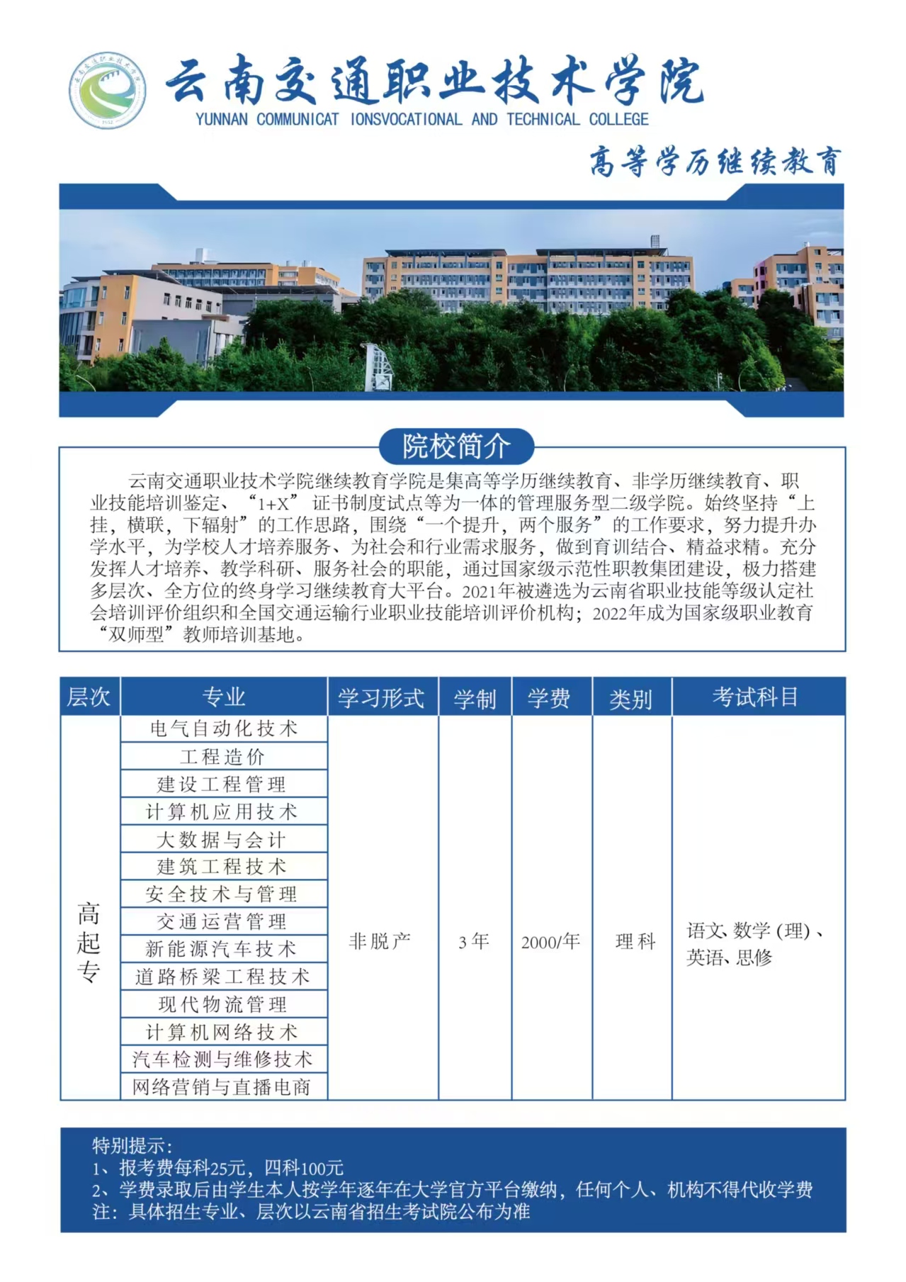 云南交通职业学院高等学历继续教育招生专业一览表
