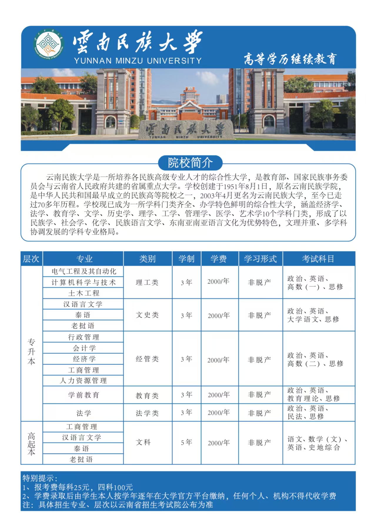 云民大的成人教育主要由继续教育学院统一管理,并在昆明及云南省各地州设有设有校外教学辅助团队。