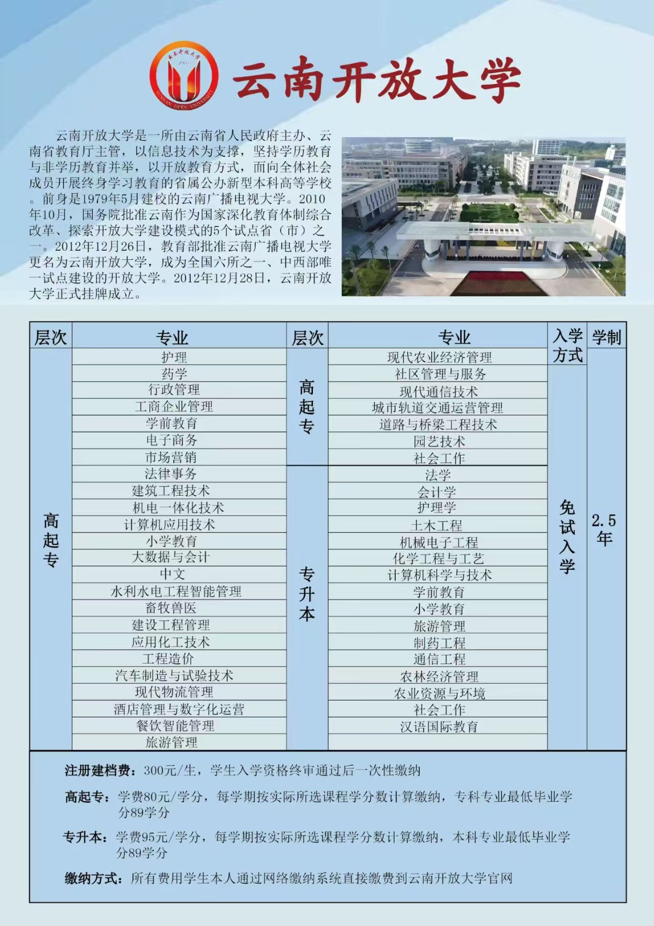 云南开放大学提供高起专、专升本两个层次的学历教育