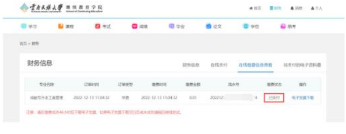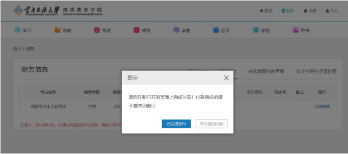 4、支付完成后,回到一开始网页【提示】支付状态;可点击 【已完成支付】,如未提示点击【财务】-【在线缴费信息查看】可 以查看缴费是否成功。