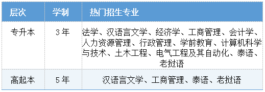 云南民族大学的非脱产教育以文史、经管、法学类见长,同时也开设了具有民大特色的东南亚语种专业。