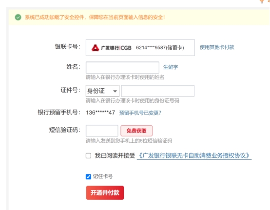 七、输入姓名和身份证号码、短信验证码后点击“开通并付款”