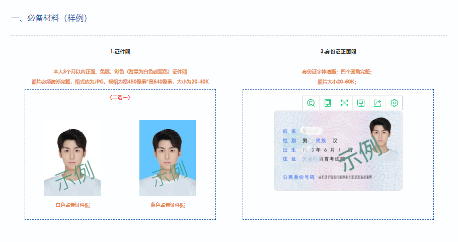 1.上传报名照片。考生需上传近期证件照1张、身份证电子照片(人像面)1张。证件照必须为本人3个月以内照片、正面、免冠、彩色(白底或蓝底)、清晰完整,需显示双肩、双耳,露双眉,不得上传全身照、风景照、生活照、背带(吊带)衫照、艺术照、侧面照、不规则手机照等。照片将用于生成准考证、注册学籍等。