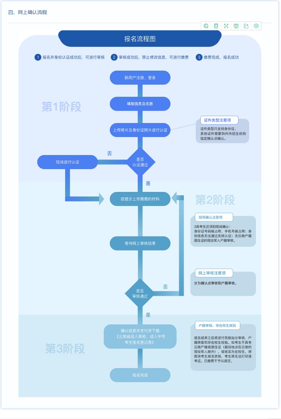 免试考生需逐级审核。身份证号或手机号被占用、身份信息有误、户籍不在云南的现役军人等情况,应在报名点审核时段内由考生本人携带相关材料原件前往报名点现场审核。