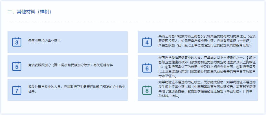 (4)服役地点在云南的现役军人报考,如无云南户籍或居住证,网上报名时应在户籍类型选择“驻滇部队现役军人”,根据系统提示上传军官证(士兵证)、所在部队旅(团)级以上单位政治部门出具的部队同意报考证明原件扫描件,并由考生本人携带身份证和以上材料原件,于规定时间内前往部队所在地的报名点现场审核。