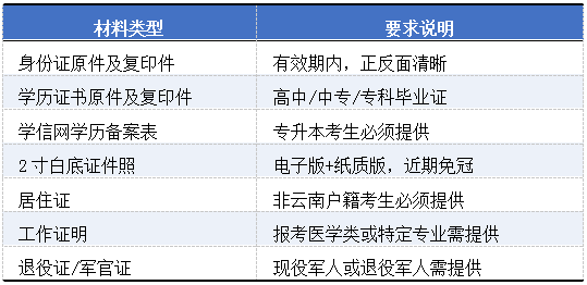 建议提前准备学历证明、身份材料等及提前联系云南各大学直属教学点(云滇博联教育)进行了解报名备考等,以便获得更准确的解答,以免错过耽误。